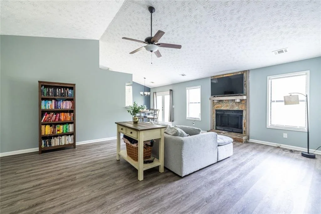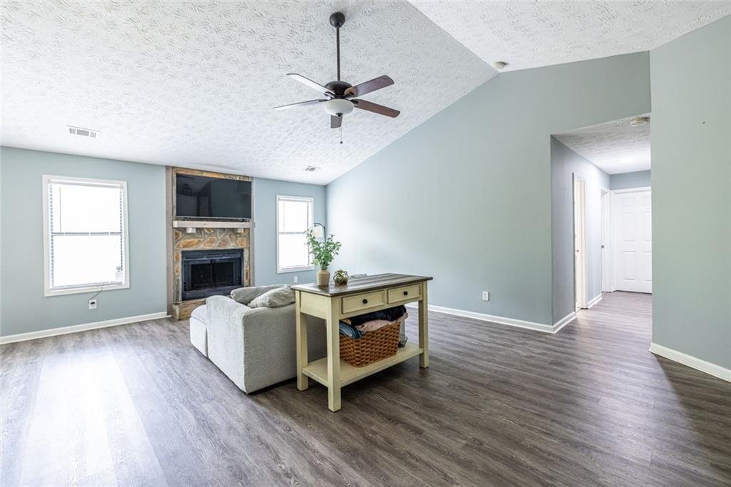Welcome to this beautifully updated ranch in the sought-after River Oaks community—where easy, one-level living meets the lifestyle so many buyers are searching for in Woodstock. This well-maintained 3-bedroom, 2-bath home offers charm and thoughtful updates throughout. The heart of the home is the oversized living room, featuring soaring vaulted ceilings and a cozy stone fireplace that creates an inviting focal point. With its impressive scale and open feel, this is a space that truly sets the home apart—perfect for both everyday living and gathering with friends and family. Just off the main living space and through the dedicated dining area, the kitchen has been thoughtfully renovated with quartz countertops, warm wood cabinetry, stainless steel appliances, and a built-in window bench that creates a charming breakfast nook. The primary suite offers vaulted ceilings, generous closet space, and an updated bath with double vanity and a tiled walk-in shower. Two additional bedrooms share a renovated hall bath, ideal for guests or family. A convenient laundry area is tucked just off the garage entry. Outside, enjoy a private, fully fenced backyard with a patio ready for grilling, gathering, or simply unwinding, along with a storage shed for added functionality. The home also features a two-car garage and generous driveway parking, offering plenty of space for both residents and guests. Located just minutes to Downtown Woodstock, you’ll enjoy easy access to local restaurants, breweries, boutique shopping, and year-round events—including outdoor concerts at the community amphitheater. Nearby, the highly anticipated Little River Park—a 110-acre park currently underway—will offer scenic river trails, a lake for fishing and kayaking, dog parks, playgrounds, and connectivity to existing trail systems. Quick access to I-575 makes commuting simple while still enjoying the charm of this established neighborhood.