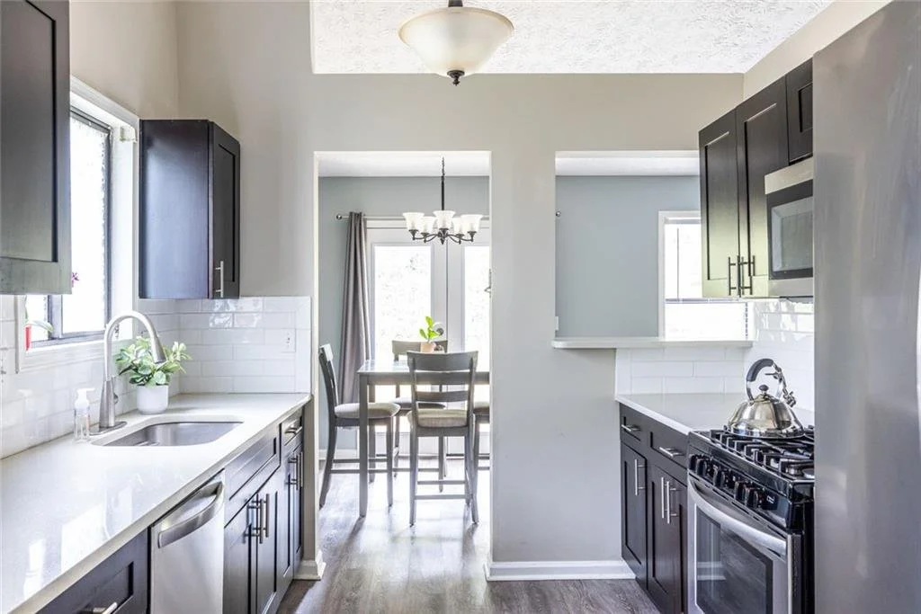 Renovated kitchen with quartz counters & cozy window bench nook